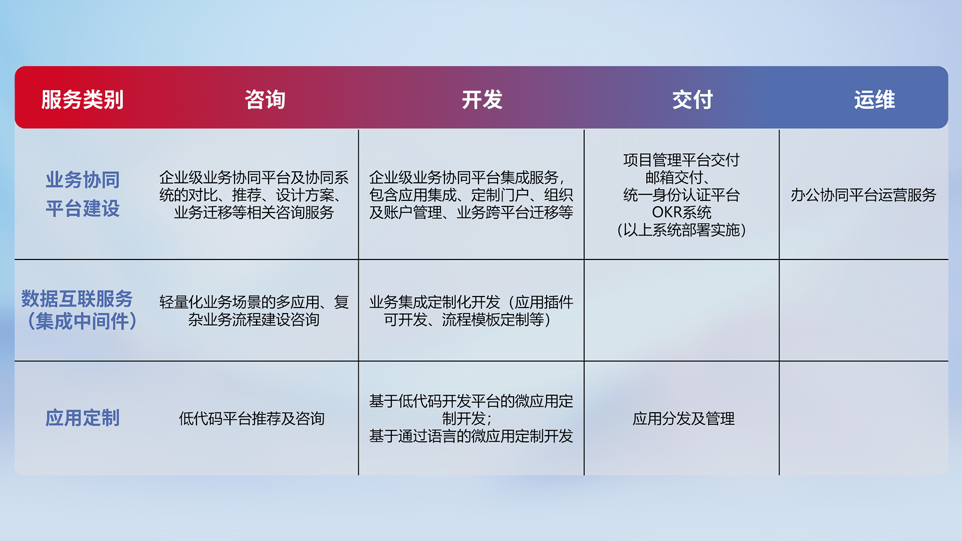 针对钉钉、、企微、、、IDaas等平台级产品提供产品的规划、、、方案、、交付、、、定制化开发等服务,,,实现如统一协同办公、、智能客户服务、、混合会议管理、、、智能数据查询、、、、等业务场景,,实现数字化转型。。。