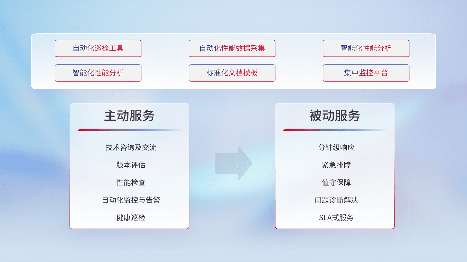 智能化工具和标准化文档,,,,保障服务质量,,,提供主动服务(包含技术咨询、、、、版本评估、、、性能检查、、自动化监控与告警、、、、健康巡检)和被动服务包含(分钟级响应、、、、紧急排障、、、值守保障、、、问题诊断解决、、、、SLA服务)。。。。